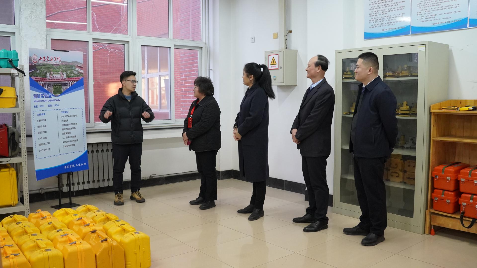 徐志珍教授首先来到工程测量教学实验室和水力学教学实验室,实地考察我院实验室建设与运行情况。刘恒彬、刘楠、刘伟、尹文军四位老师向徐教授详细介绍了实验室设备配置及实验课程开展情况。徐教授与在场教师进行了深入交流,对我院教学实验室建设成效给予了充分肯定,并就实验教学与实验室建设提出了宝贵建议。