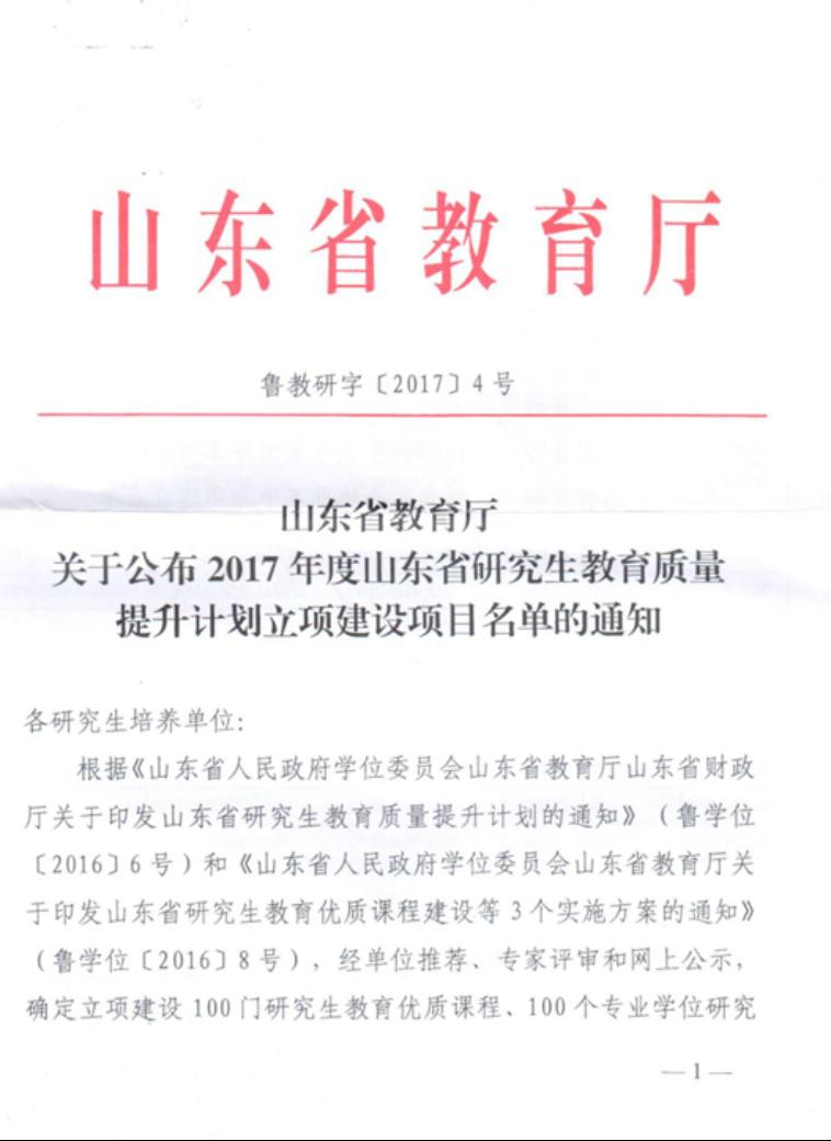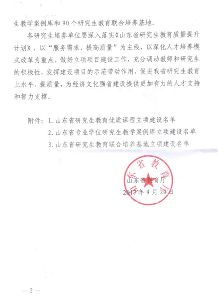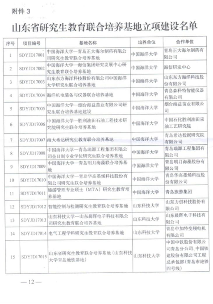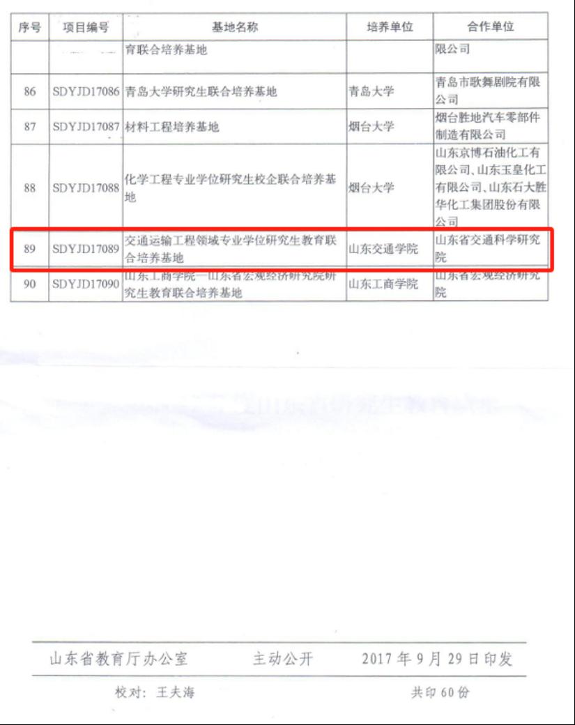 山东省教育厅:交通运输工程领域专业学位研究生教育联合培养基地2017年