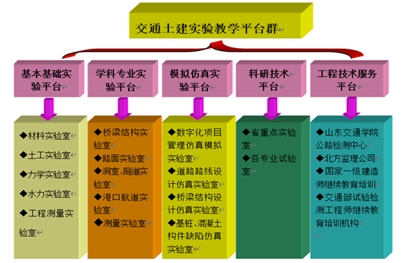 学院下设8个基层教学组织,建有交通土建实验中心、公路检测中心、公路环境与岩土工程研究中心、桥梁检测与加固技术研究所等教学科研机构,并建设有“智能建造装备关键技术与系统山东省重点实验室”“公路基础设施智慧建造与运维山东省重点实验室”等省部级科研平台,为学生实践与科研提供有力支撑。