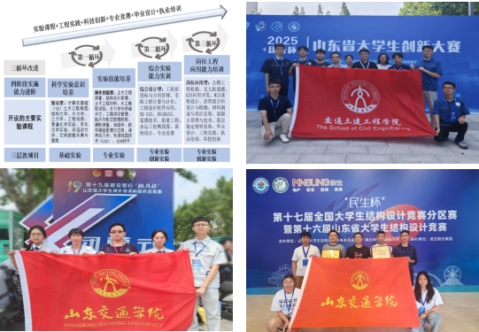 学院构建“四阶段-三循环-三级能力”卓越人才实践培育体系,深化产教融合,与龙头企业共建产学研基地,强化顶岗实习。近三年,学生在“挑战杯”“互联网+”“结构设计竞赛”等赛事中获省级以上奖项300余项,发表学术论文60余篇,获批国家专利30余项。毕业生一次就业率保持在80%以上,超60%入职中交、中铁、中建、山东路桥等大型企业。
