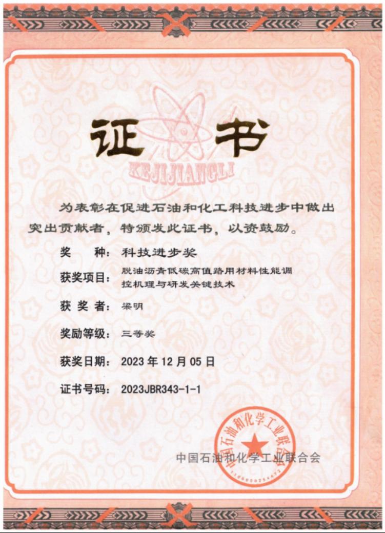 2023年“脱油沥青低碳高值路用材料性能调控机理与研发关键技术”获科技进步三等奖