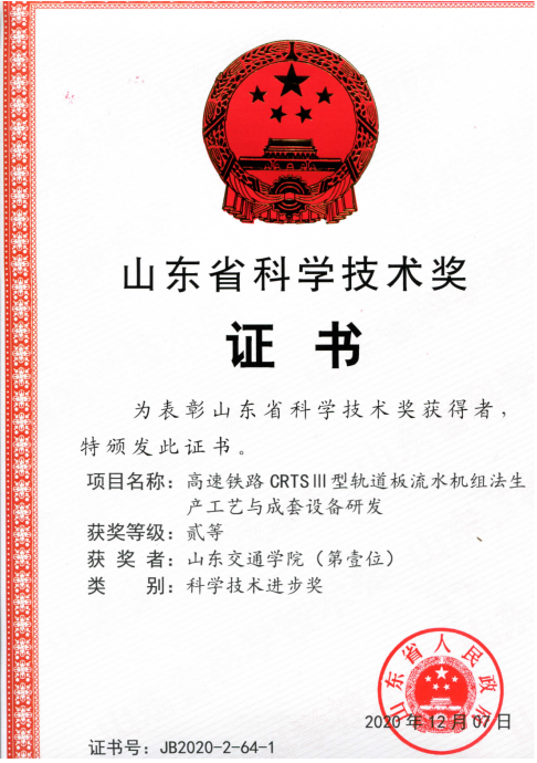 2020年“高速铁路CRTSⅢ型轨道板流水机组法生产工艺与成套设备研发”获山东省科技进步二等奖