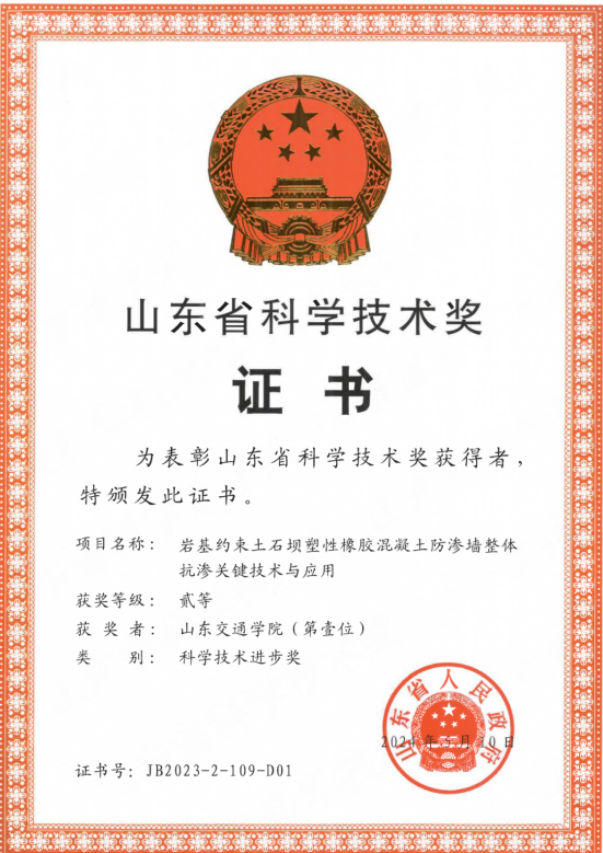2024年“岩基约束土石坝塑性橡胶混凝土防渗墙整体抗渗关键技术与应用”获山东省科技进步二等奖