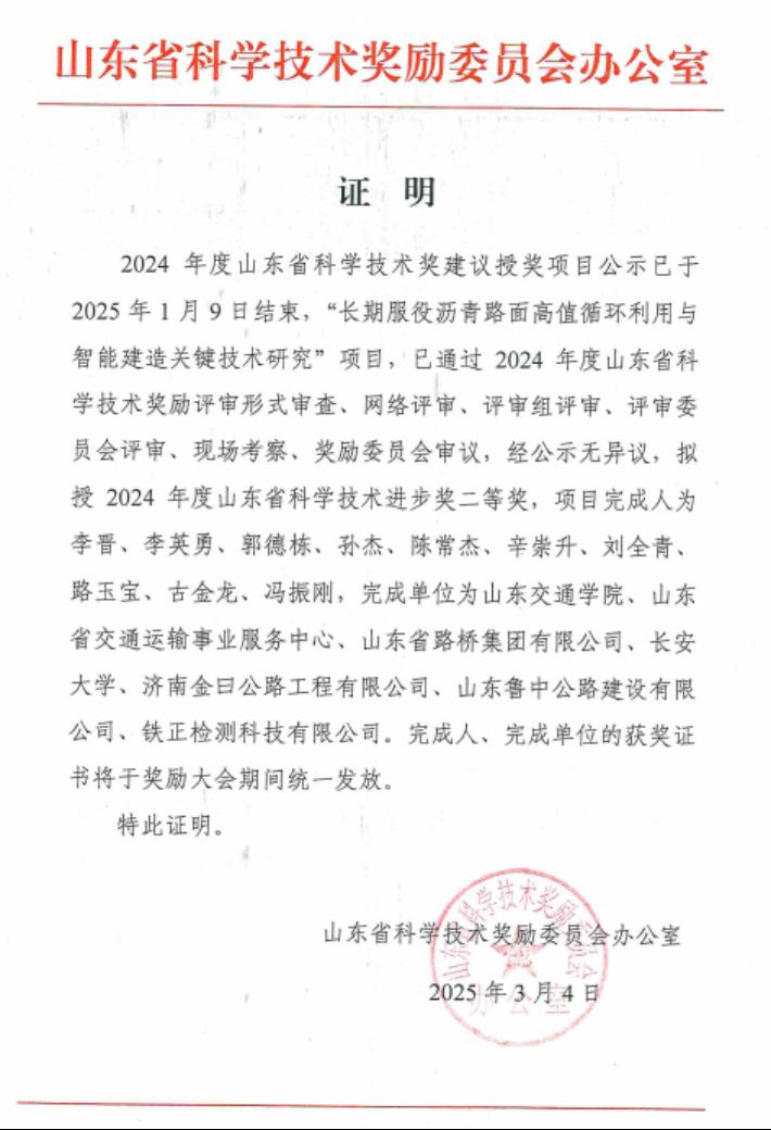 2025年“长期服役沥青路面高值循环利用与智能建造关键技术研究”获山东省科技进步二等奖