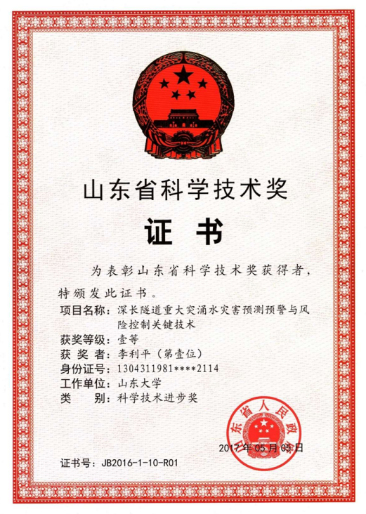 2017年“深长隧道重大突涌水灾害预测预警与风险控制关键技术”获山东省科学技术进步一等奖