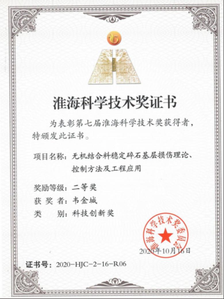 2023年“无机结合料稳定碎石基层损伤理论、控制方法及工程应用”获淮海科学技术二等奖