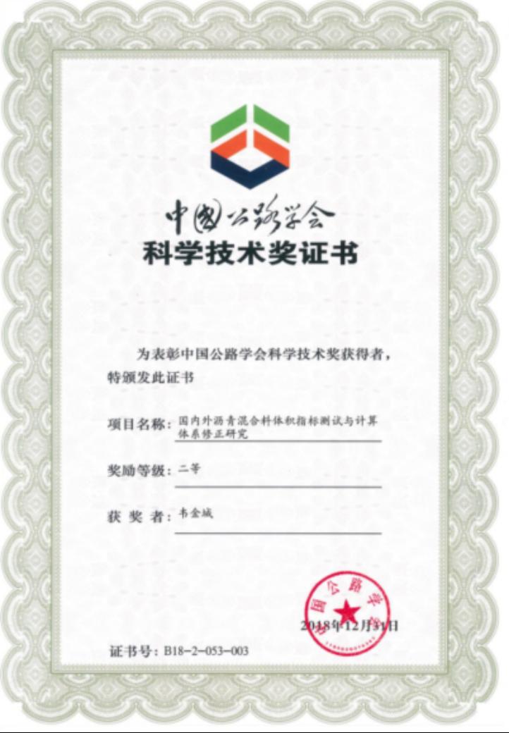 2018年“国内外沥青混合料体积指标测试与计算体系修正研究”获中国公路学会科学技术二等奖