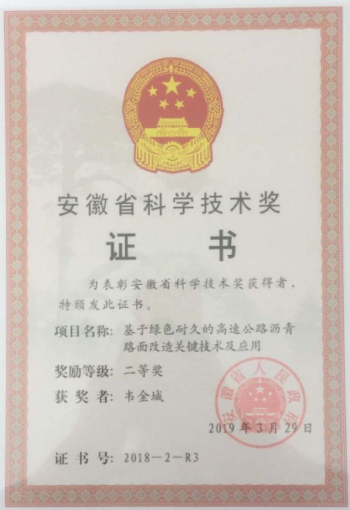 2019年“基于绿色耐久的高速公路沥青路面改造关键技术及应用”获安徽省科学技术二等奖