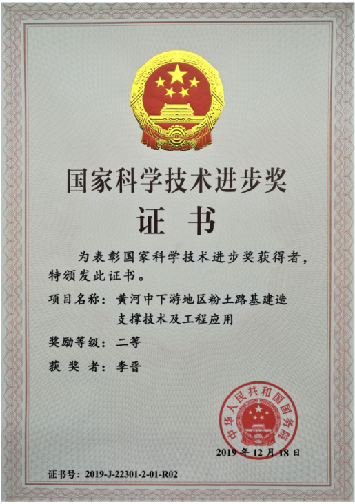 2019年“黄河中下游地区粉土路基建造支撑技术及工程应用”获国家科学技术进步二等奖