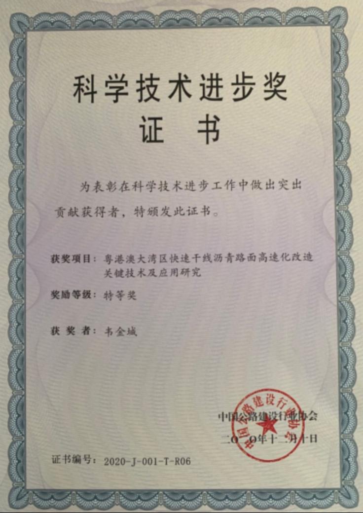 2020年“粤港澳大湾区快速干线沥青路面高速化改造关键技术及应用研究”获中国公路建设行业协会特等奖