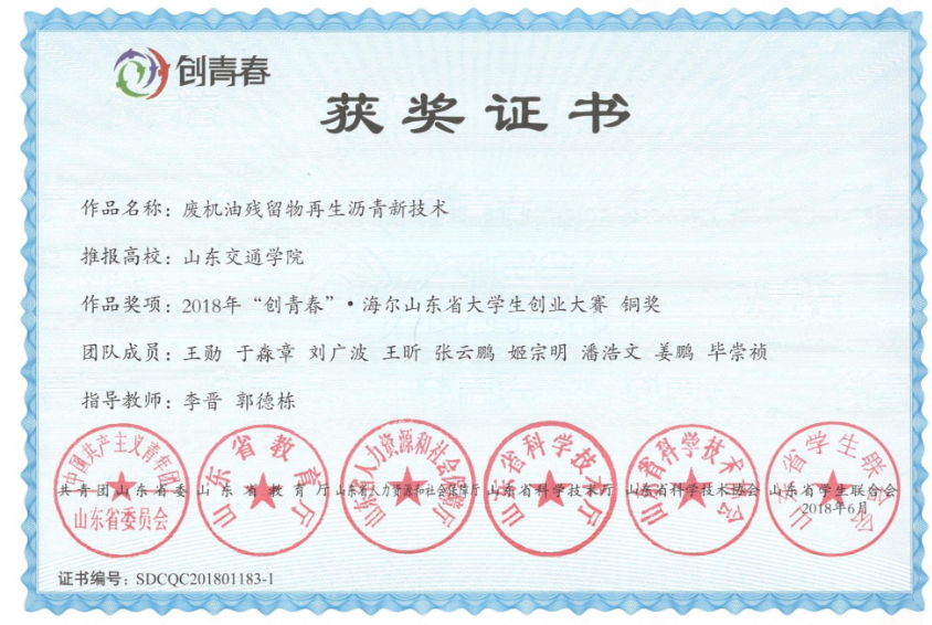 2018年“废机油残留物再生沥青新技术”荣获“创青春”海尔山东省大学生创业大赛铜奖