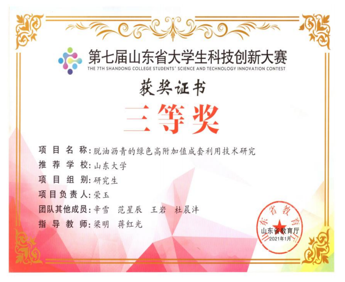 2021年“脱油沥青的绿色高附加值成套利用技术研究”获第七届山东省大学生科技创新大赛三等奖