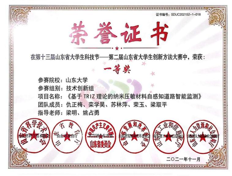 2021年“基于TRIZ理论的纳米压敏材料自感知道路智能监测”获第二届山东省大学生创新方法大赛一等奖