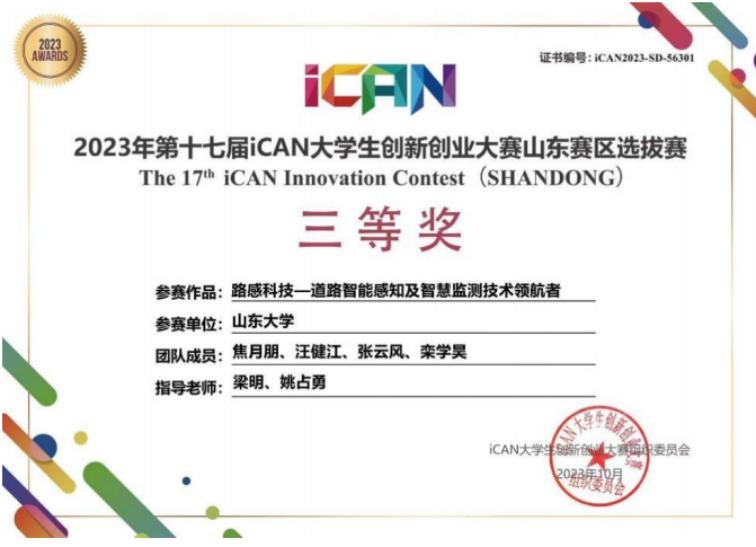 2023年“路感科技一道路智能感知及智慧监测技术领航者”获第十七届iCAN大学生创新创业大赛山东赛区三等奖