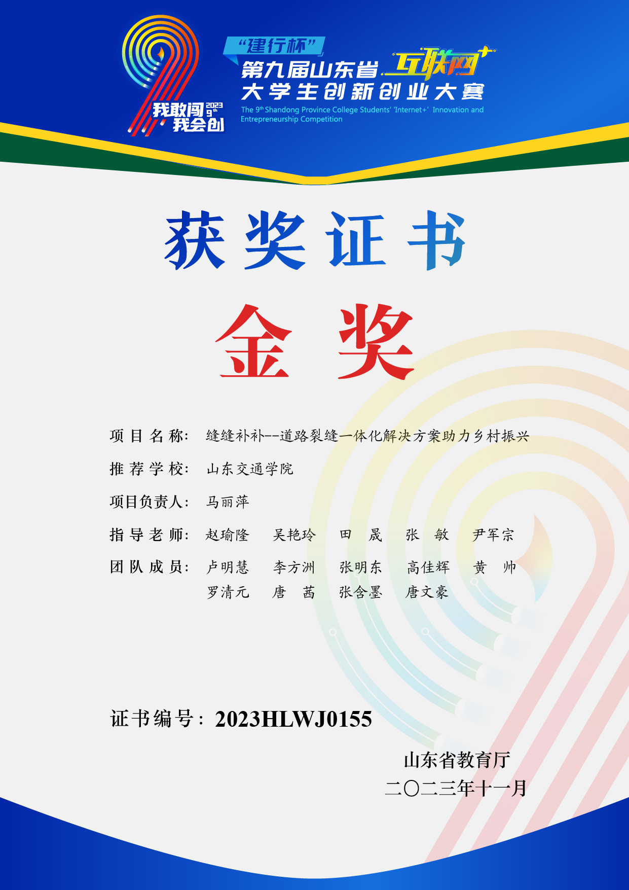 2023年“缝缝补补--道路裂缝一体化解决方案助力乡村振兴”获第九届山东省大学生创新创业大赛金奖