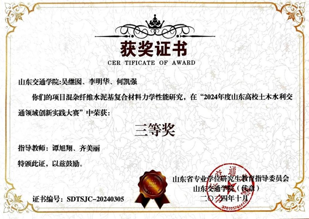 2024年“混杂纤维水泥基复合材料力学性能研究”获山东高校土木水利交通领域创新实践大赛三等奖
