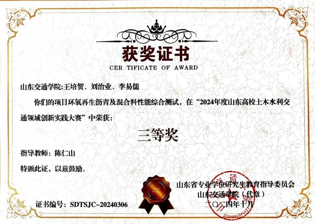 2024年“环氧再生沥青及混合料性能综合测试”获山东高校土木水利交通领域创新实践大赛三等奖
