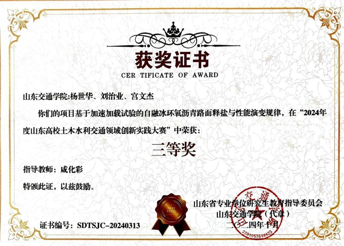 2024年“基于加速加载试验的自融冰环氧沥青路面释盐与性能演变规律”获山东高校土木水利交通领域创新实践大赛三等奖
