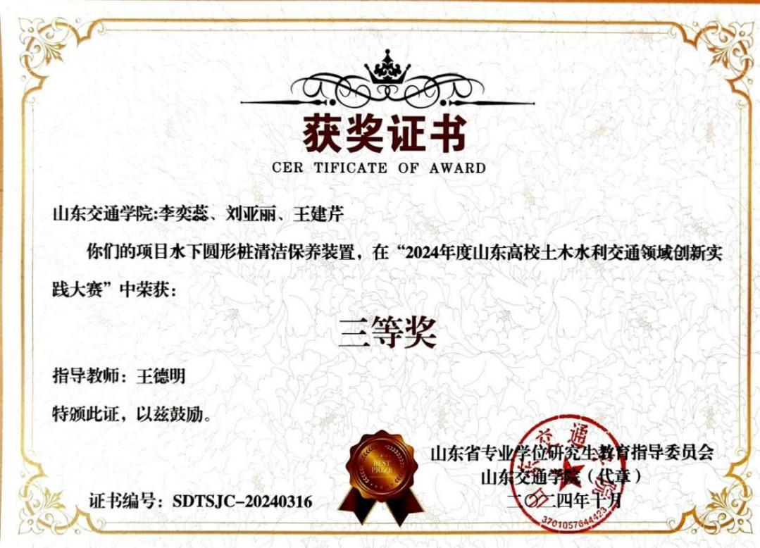 2024年“水下圆形桩清洁保养装置”获山东高校土木水利交通领域创新实践大赛三等奖