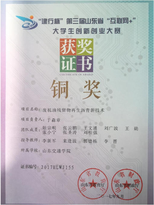 2017年“废机油残留物再生沥青新技术”荣获第三届“互联网+”创新创业大赛铜奖
