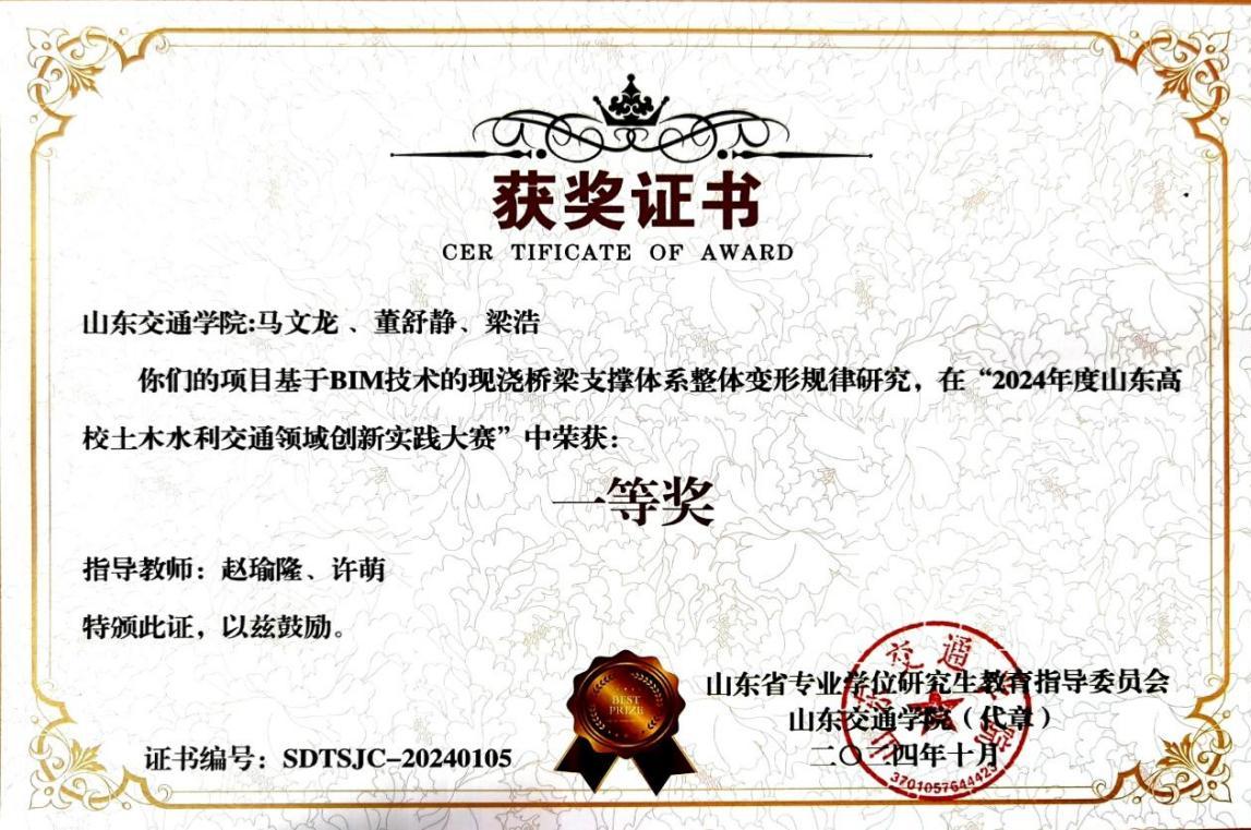 2024年“基于BIM 技术的现浇桥梁支撑体系整体变形规律研究”获山东高校土木水利交通领域创新实践大赛一等奖
