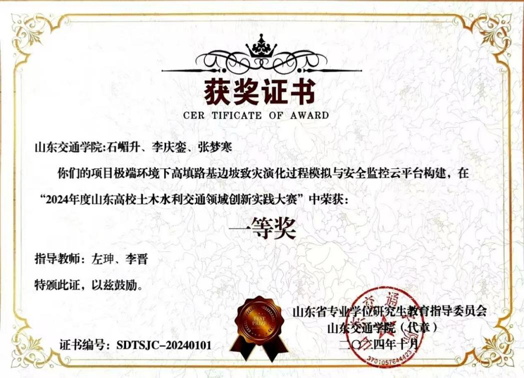 2024年“极端环境下高填路基边坡致灾演化过程模拟与安全监控云平台构建”获山东高校土木水利交通领域创新实践大赛一等奖