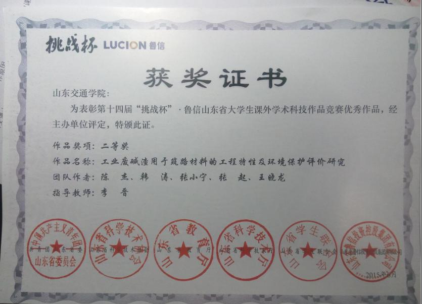 2015年“工业废碱渣用于筑路材料的工程特性及环境保护评价研究”荣获第十四届“挑战杯”二等奖