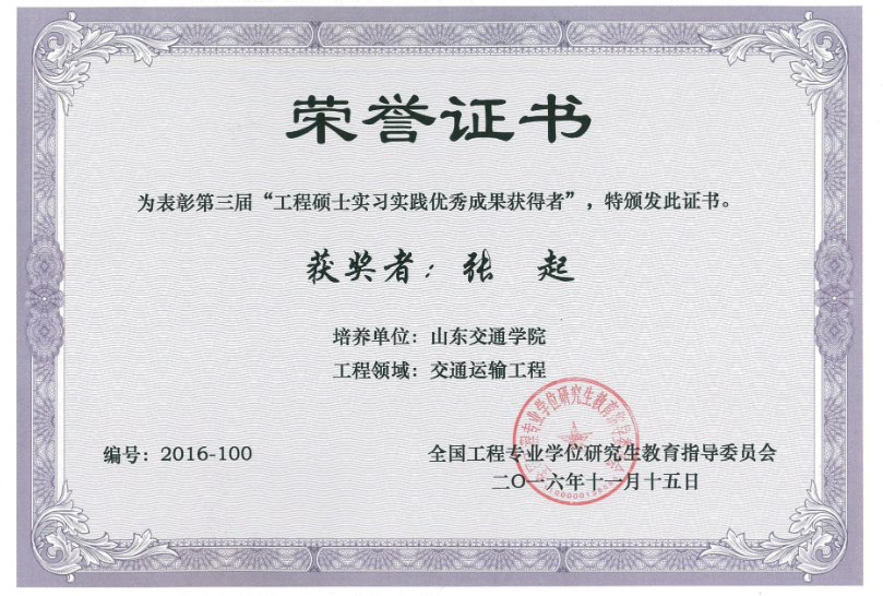 2016年研究生张起获得第三届“工程硕士实习实践优秀成果奖”