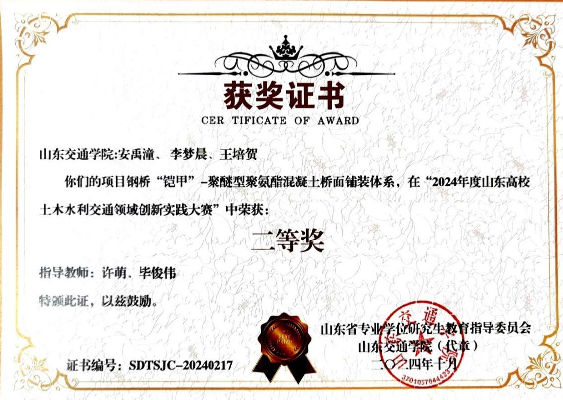 2024年钢桥“铠甲”-聚醚型聚氨酯混凝土桥面铺装体系获山东高校土木水利交通领域创新实践大赛二等奖