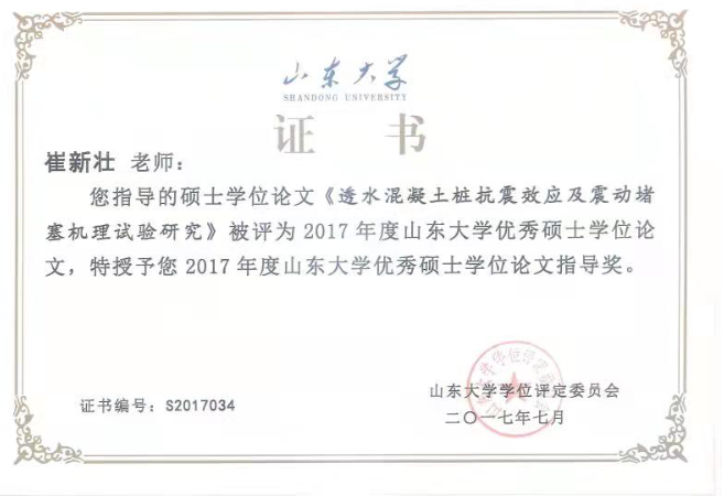 2017年崔新壮指导的硕士学位论文《透水混凝土桩抗震效应及震动堵塞机理试验研究》被评为山东大学优秀硕士学位论文指导奖